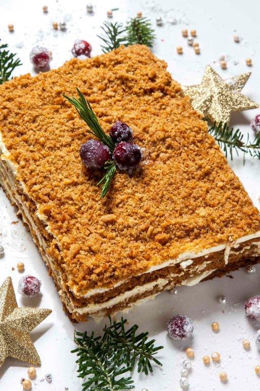 Cieniutkie blaty ciasta z naturalnego miodu i jaj. Cieniutkie warstwy przełożone lekko ukwaszoną, gęstą śmietanką (creme fraiche). Wyjątkowe ciasto o fenomenalnej konsystencji i smaku.