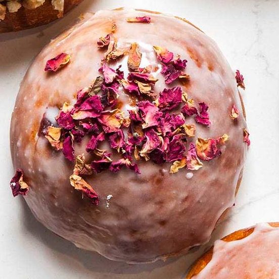 / Pączek pieczony z konfiturą z płatków róży z lukrem i płatkami róży