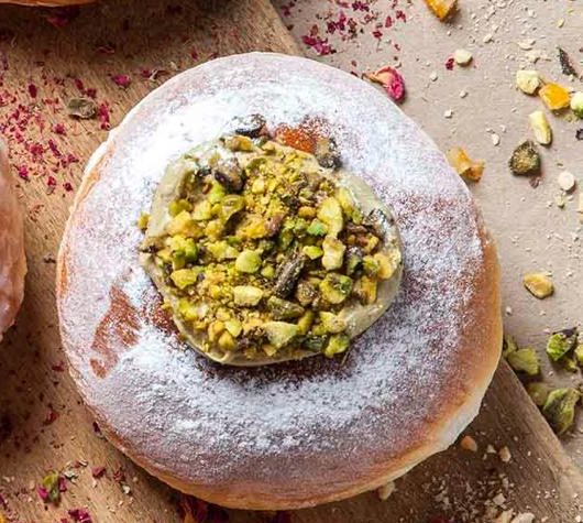 Pączek pieczony z konfiturą z płatków róży z cukrem pudrem