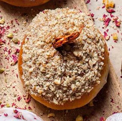 Pączek pieczony z konfiturą z płatków róży z lukrem i płatkami róży
