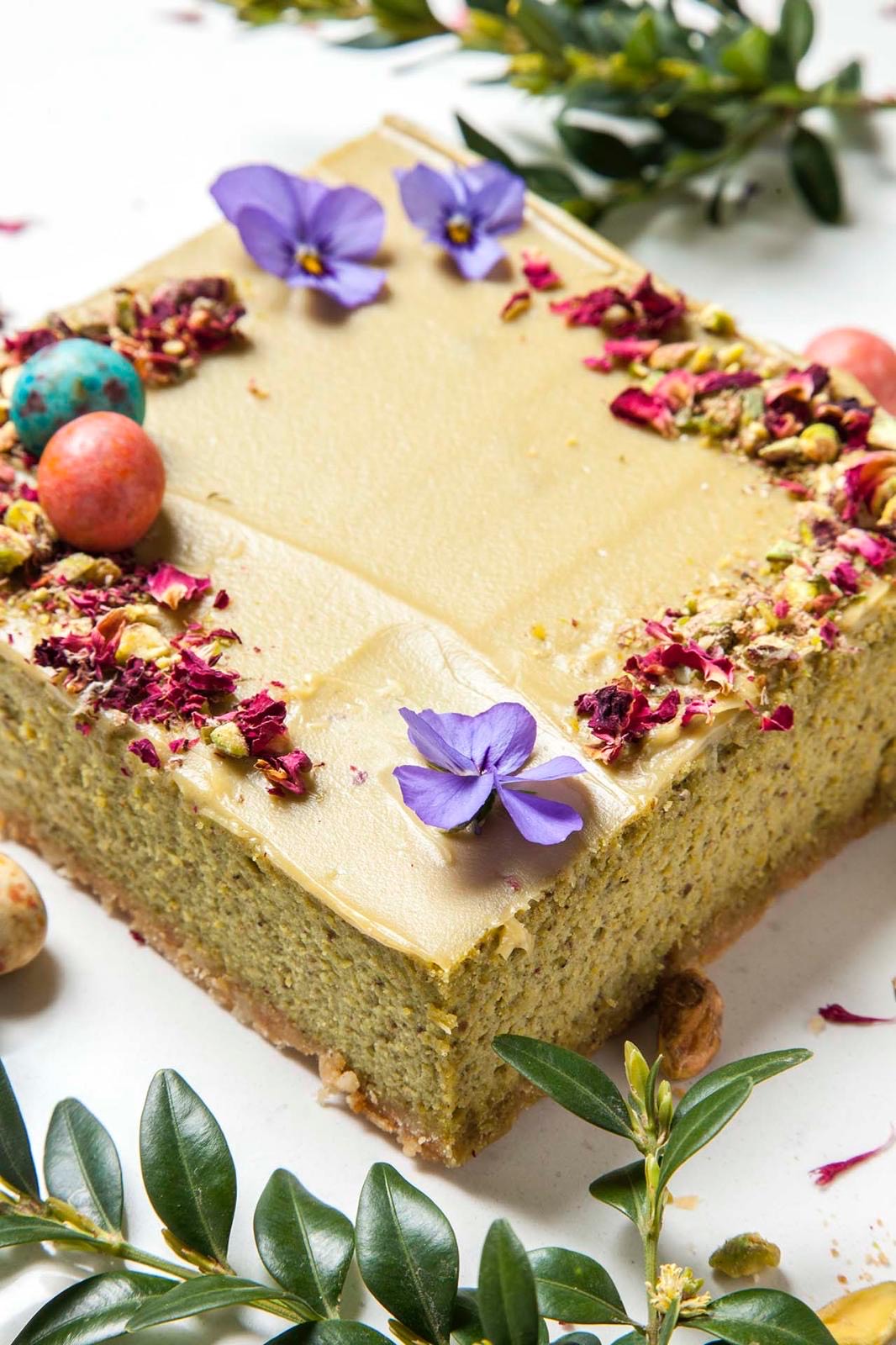 kruchutki maślany spód, na serku śmietankowym, wilgotny, kremowy, z naszą pastą pistacjową, polany ganachem pistacjowym.
